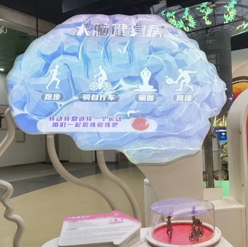 展品围绕大脑模型,分别设置好习惯造就好大脑、大脑健身房、睡眼朦胧三个互动体验区,通过互动操作,使观众了解养成良好的生活习惯可以锻炼大脑,增强大脑的功能;运动不仅能保持身体健康,还能提高认知能力;正确认识睡眠,消除对睡眠的误区,倡导观众科学养脑。
