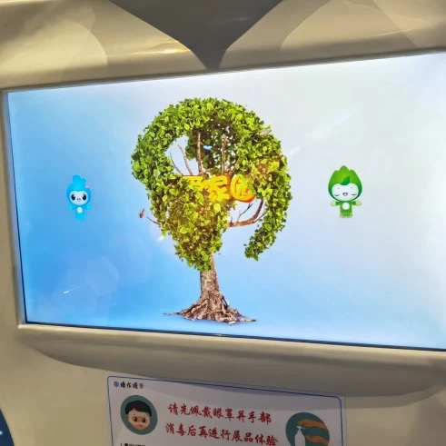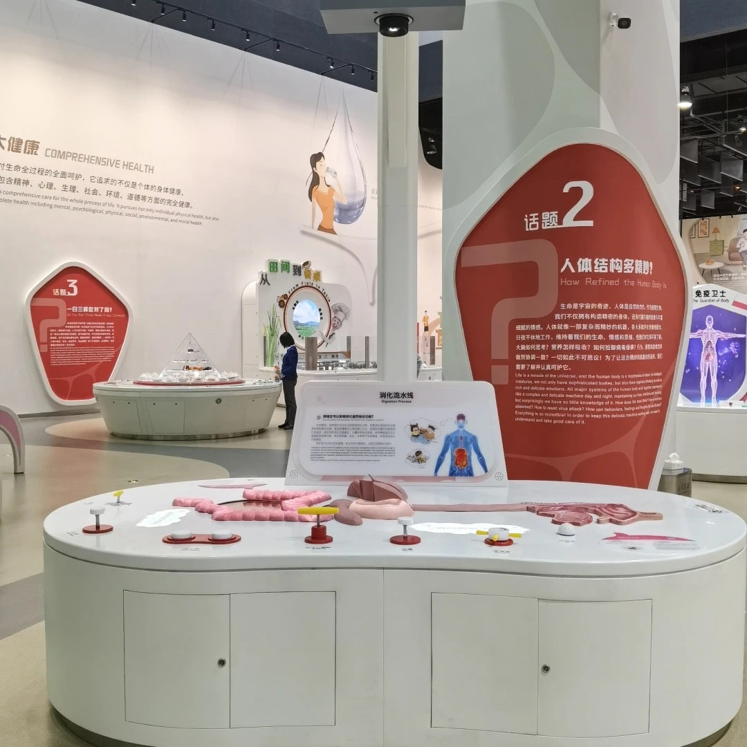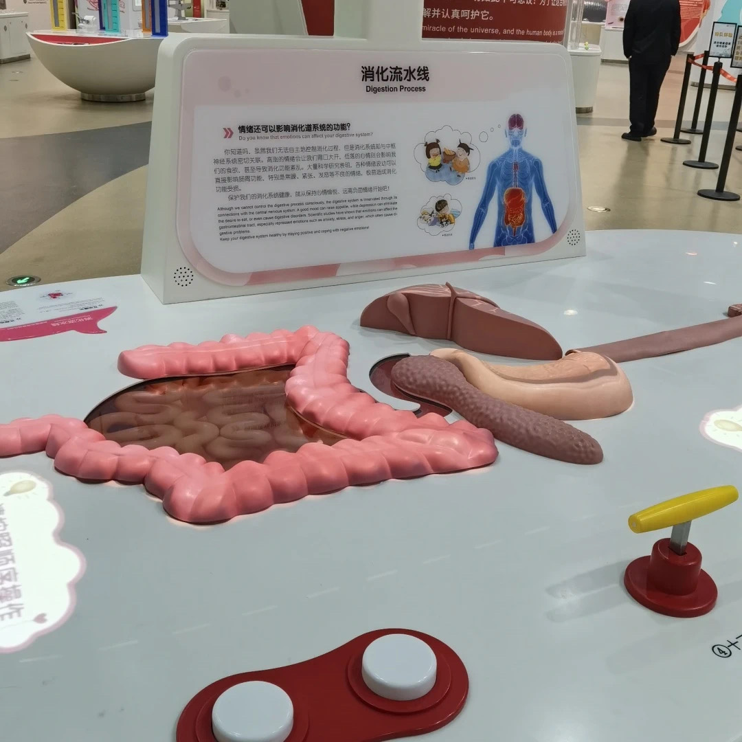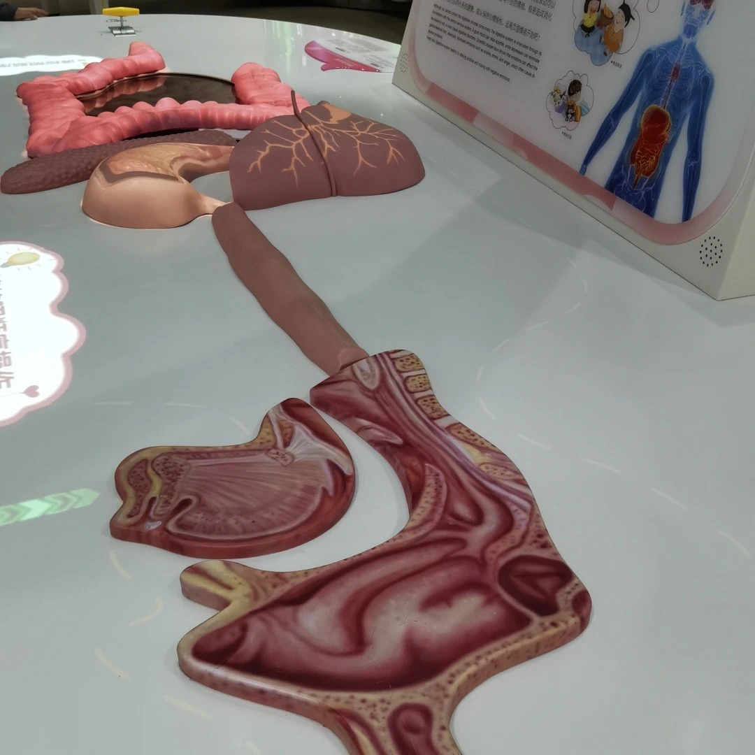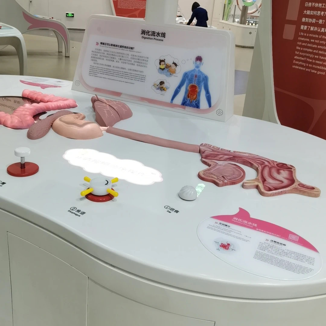 展品以桌面开放式人体消化道为场景,采用仿真模型加投影动画的形式,通过相应的互动操作体验食物在消化道各个器官中移动和消化吸收的过程,了解食物在此发生的变化,深切理解饮食方式与消化道健康的关系。