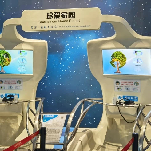 美丽地球是人类生生世世赖以生存的家园,但工业革命以来,人类文明发展迅速,造成了严重的生态环境、资源、气候等方面的问题。近10年来,中国在生态文明以及美丽中国的建设上取得了显著成效,不过环境污染的治理、美丽中国的建设不可能一蹴而就,需要长期努力且全民参与其中。观众通过脚踏方式选择时空的向前向后移动,从全球的视野了解每个内容过去的美好、现在的问题和未来的挑战,以及中国的发展战略,采用时空对比的手段,使观众直面地球存在的问题,引起深入思考。