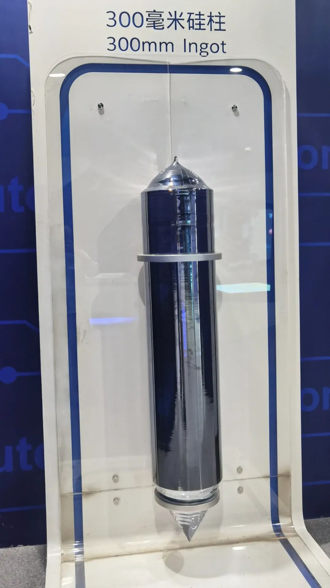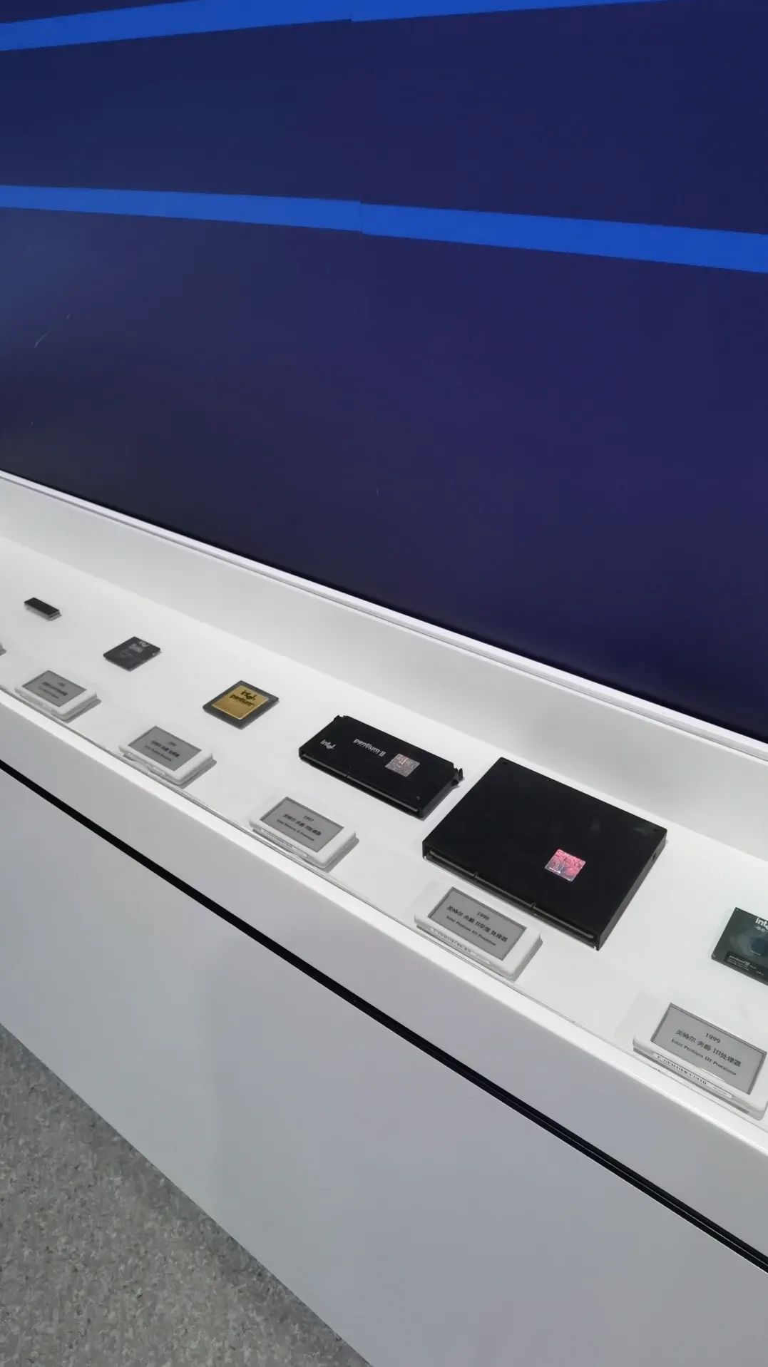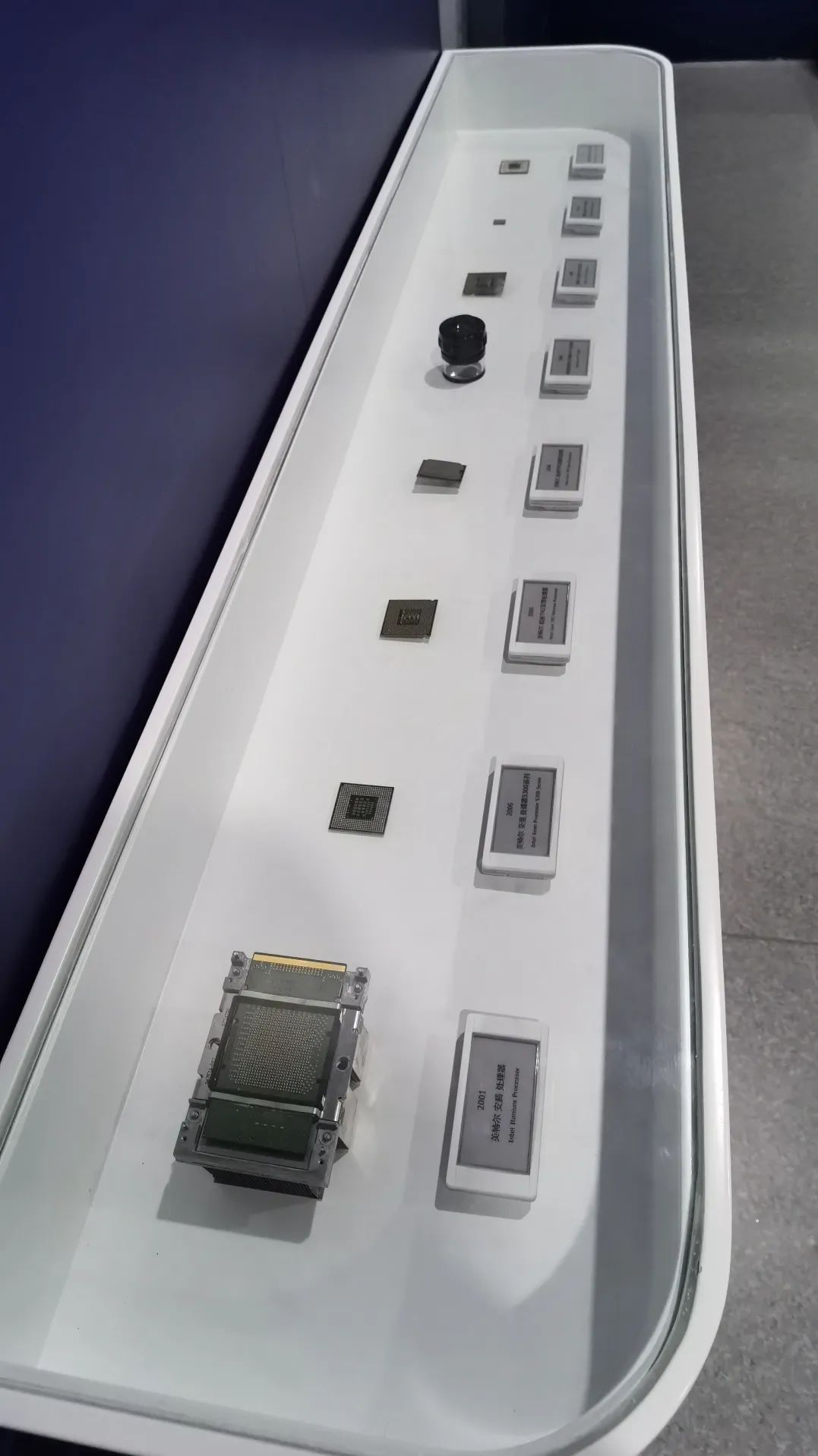 第一件展品沙子。看起来很平常的沙子就是芯片的原材料。工厂对沙子进行提纯,可以得到芯片的原材料硅,再对硅进行处理以后,可以得到我们的空白晶圆,最后在空白晶圆上进行刻电路。晶圆的直径的大小直接决定了所刻芯片的数量,晶圆的直径越大所刻的芯片数量越大,芯片的成本也就越低。随着科技的发展,芯片的直径已经从最初的50毫米扩大到300毫米。旁边的展品就是300毫米的硅柱,工厂就是利用对这种300毫米的硅柱进行切割得到300毫米直径的晶圆。在空白晶圆后进行刻电路,之后就可以得到裸芯片。所谓裸芯片就是说它还没有进行封装和测试,进行封装和测试以后便是一块成熟的芯片。一块成熟的芯片只有指甲盖那么大小,但是它内部却蕴含了几百万个甚至上亿个晶体管,上到宇宙空间站和运载飞船;下到常用的手机和手表,都离不开芯片。这个展柜展示了intel公司从1974年到现在所生产的所有不同型号的芯片。从最早的1974年生产的8080处理器,一直发展到我们今天的非常先进的芯片。芯片的发展历程,也展示了我们人类社会发展的历程。