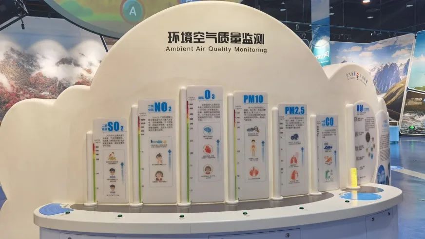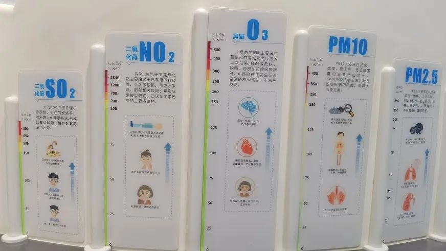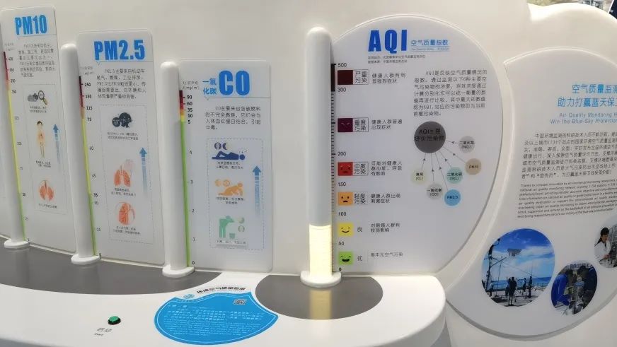 近年来,空气污染问题越来越受到社会和公众的重视,随着治理力度的加大,城市雾霾持续得到改善。展品以云朵造型为背景,设计7个展示模块,发光柱对应参与空气质量评价的6个主要污染物,1个综合空气质量指数,向观众实时呈现“北京奥体中心空气质量监测点位”数据,通过不同污染物的数值展现当前位置空气质量的状况,让观众了解大气污染情况以及因此可能对健康带来的不良影响,进而提高预防意识,采取一定的防护措施。