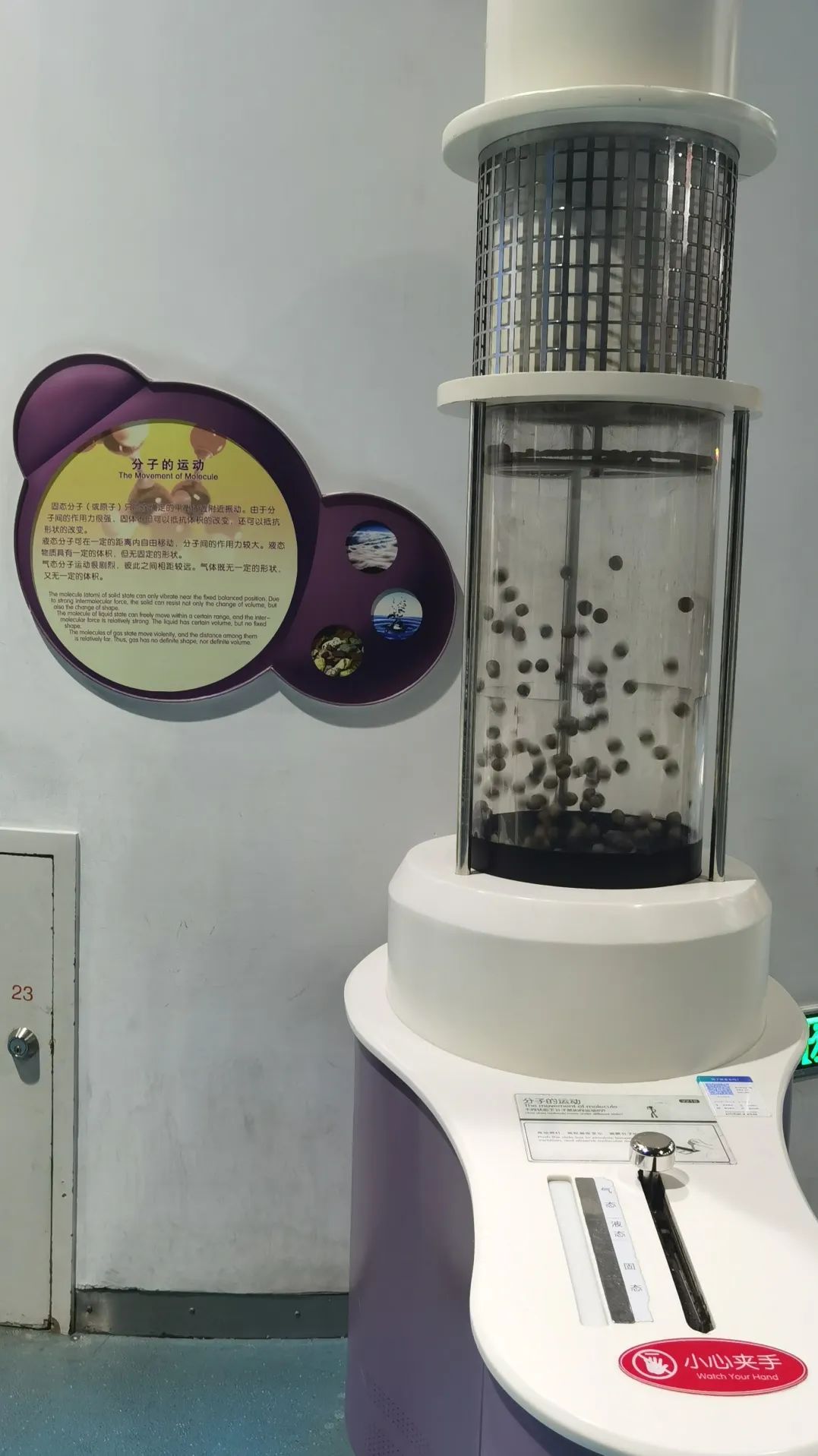物质通常有三种形态,固态、液态与气态。之所以有这三种形态,是因为物质是由分子和原子构建的,而它们的运动状态与聚集方式就决定了物质的形态。我们来看展像玻璃罩之内有一些运动的小球,它们就代表着物质当中的分子在运动。这时候您可以操作推动杆分别选择固态液态和气态三种模式,就可以观察小球的运动状态而得知分子的运动状态了。