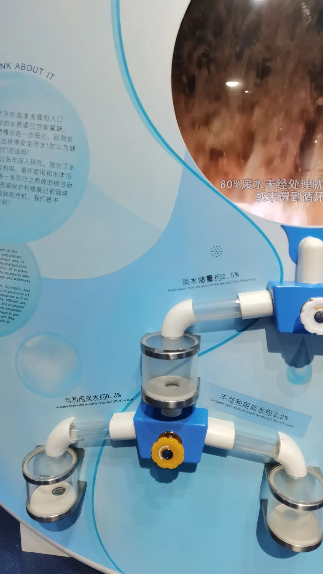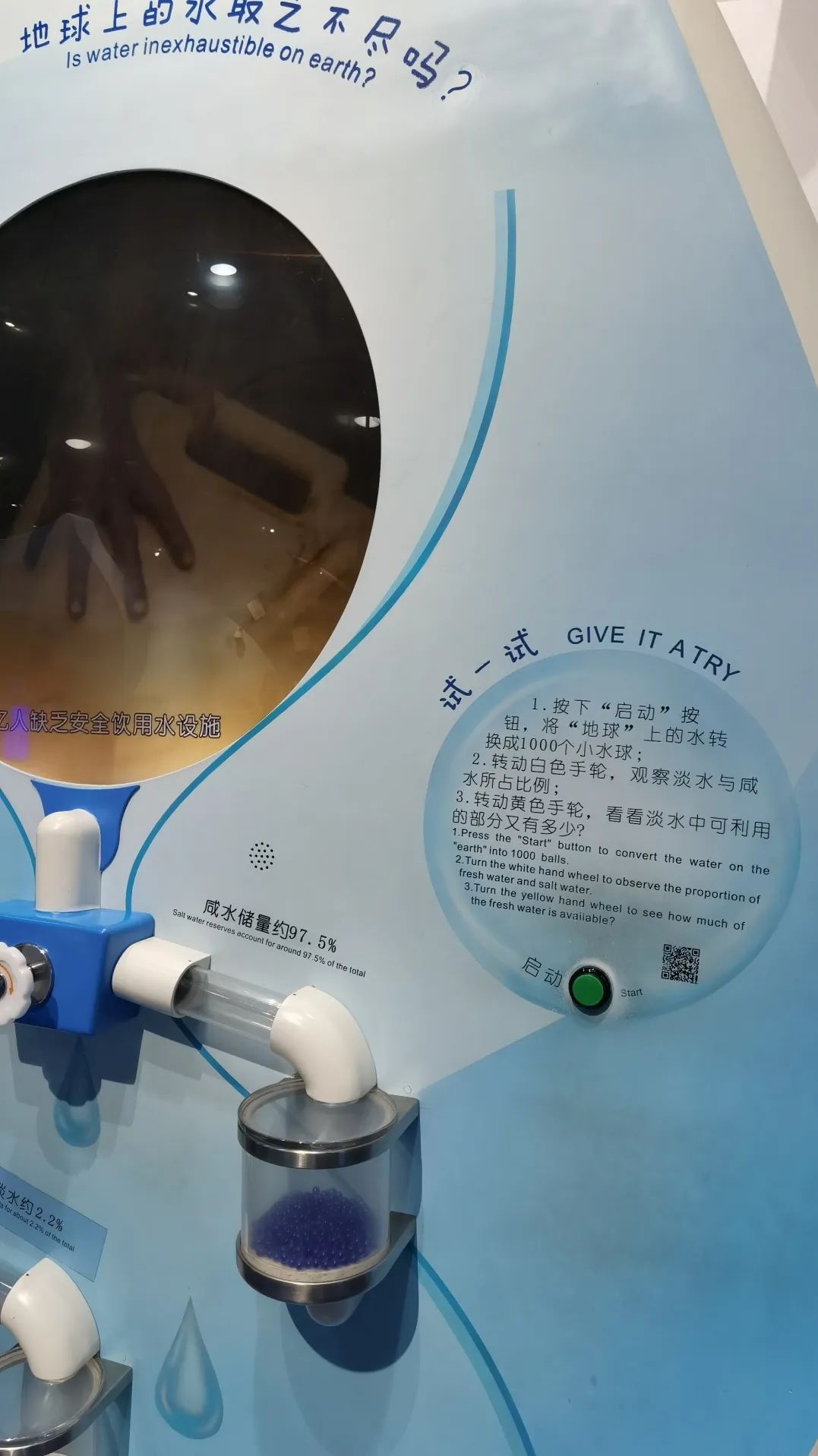 地球是一个蓝色星球,因为其表面的70%被水覆盖,但现实是,其中的97.5%为咸水,淡水仅占2.5%,绝大部分的淡水固定在南极和格陵兰的冰层中,其余多为土壤水分或深层地下水,不能被人类直接利用。展品利用蓝色小球模拟地球上的总水量,通过演示小球的分配情况,展示地球水资源的状况。观众转动白色手轮,屏幕中1000个虚拟的蓝色小球,沿着管道分别滚入咸水储球罐(975个)和淡水储球罐(25个),转动黄色手轮,淡水储球罐中的小球分别进入不可利用淡水储球罐(22个)和可利用淡水的储球罐(3个),分配数量强烈的反差同时配合显示屏的动画,引发观众对地球水危机的思考,激发保护水资源的责任感和使命感,增强观众的节水意识。