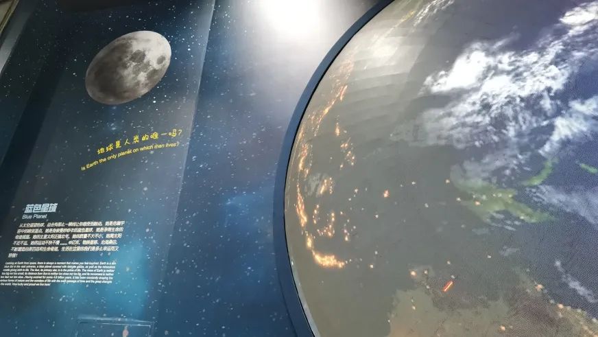 在庞大包容一切的宇宙中,人类生存的地球只是一个孤独的星点。它是目前太阳系中唯一存在生命的星球,也是唯一适宜生命繁衍的星球。至少在不远的将来,人类还无法迁居到别的星球。展品以宇宙的起源演化为切入点,通过银河系诞生、太阳系的形成、太阳系中各行星的状态,展示地球的特殊性以及对人类的唯一性,地球孕育了生机盎然的生命世界,是生命的摇篮,人类的母亲,激发公众保护地球的责任感。