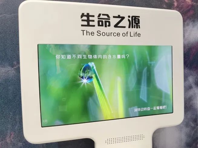 地球上的生命起源于水,水是一切生物维系生命的重要条件。人体组成中70%为水,如果是婴儿,则在80%以上。水不仅是植物重要的组成部分,植物的一切生理活动都需要水分的参与。展品由两部分组成,观众转动转盘,将转盘上不同生物的模型转到“检测”装置下,触发的视频,了解水对不同生命的重大意义。观众站到检测台,选择性别和年龄,测量体内的含水量。