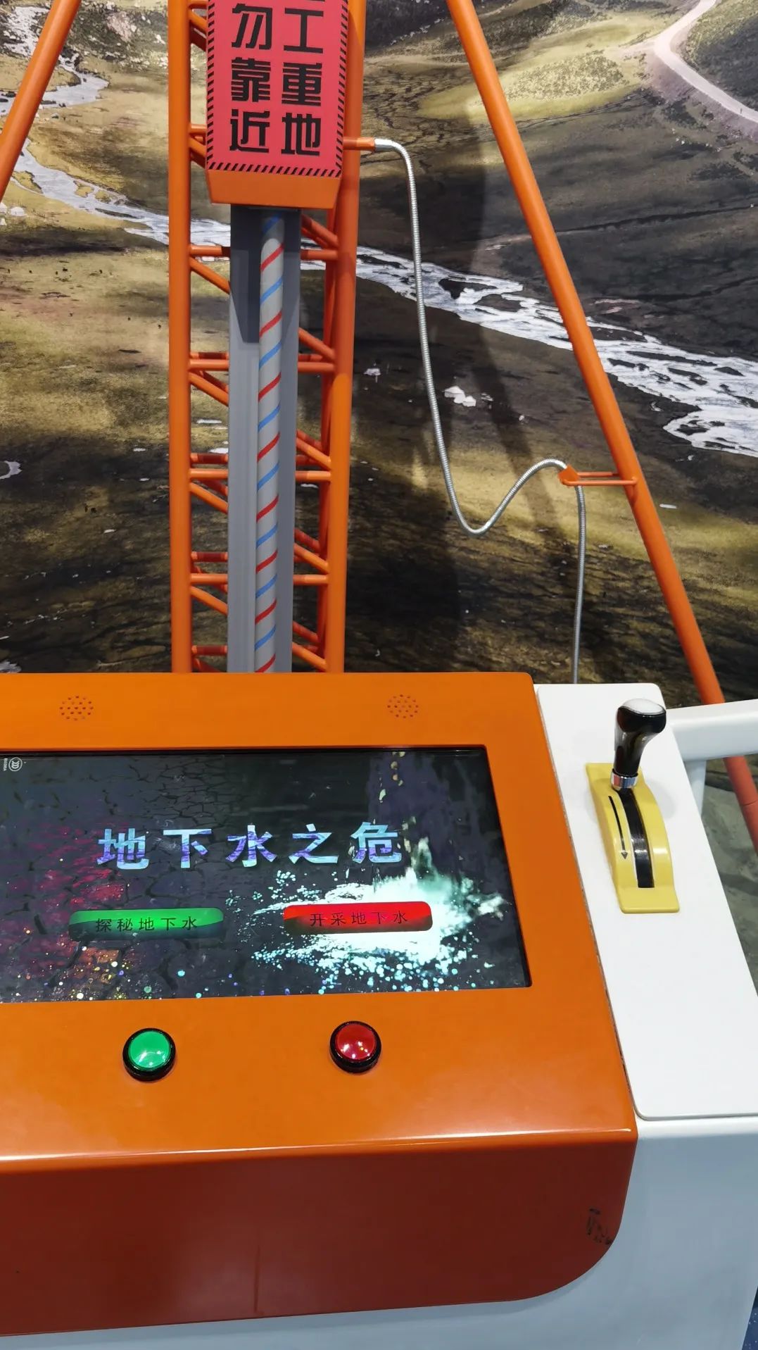 地下水是人类获得淡水资源的主要途径之一,具有流动性差、蓄水过程缓慢的特点。在潜水面(饱和带的上限)以下会形成很大水压,井须钻到潜水面以下才会有水,人们从井中抽取水到地面加以利用,当大量水被抽出时,潜水面会下降,如果短时间内无法补充足够的地下水量,会造成地下水资源短缺,还可形成地下水漏斗、造成地面塌陷。观众按下台面绿色按钮进入“探秘地下水”模式,在虚拟“小水”的引导下,下拉手柄模拟钻井,深入地下了解地下水的相关知识按下红色按钮进入“开采地下水”模式,在虚拟“小水”的引导下,按下按钮选择地下水开采点,了解不同地区地下水开采的情况和所面临的危机。