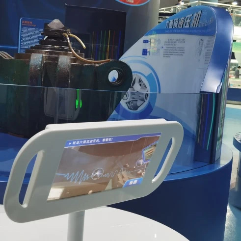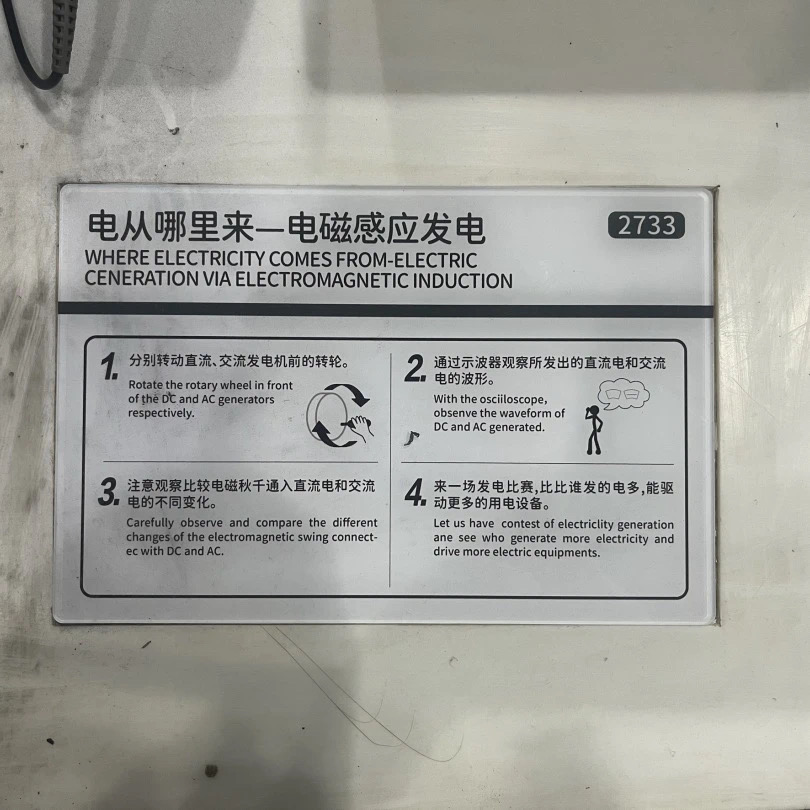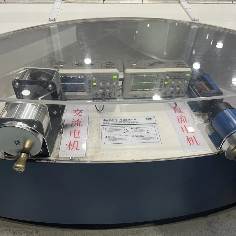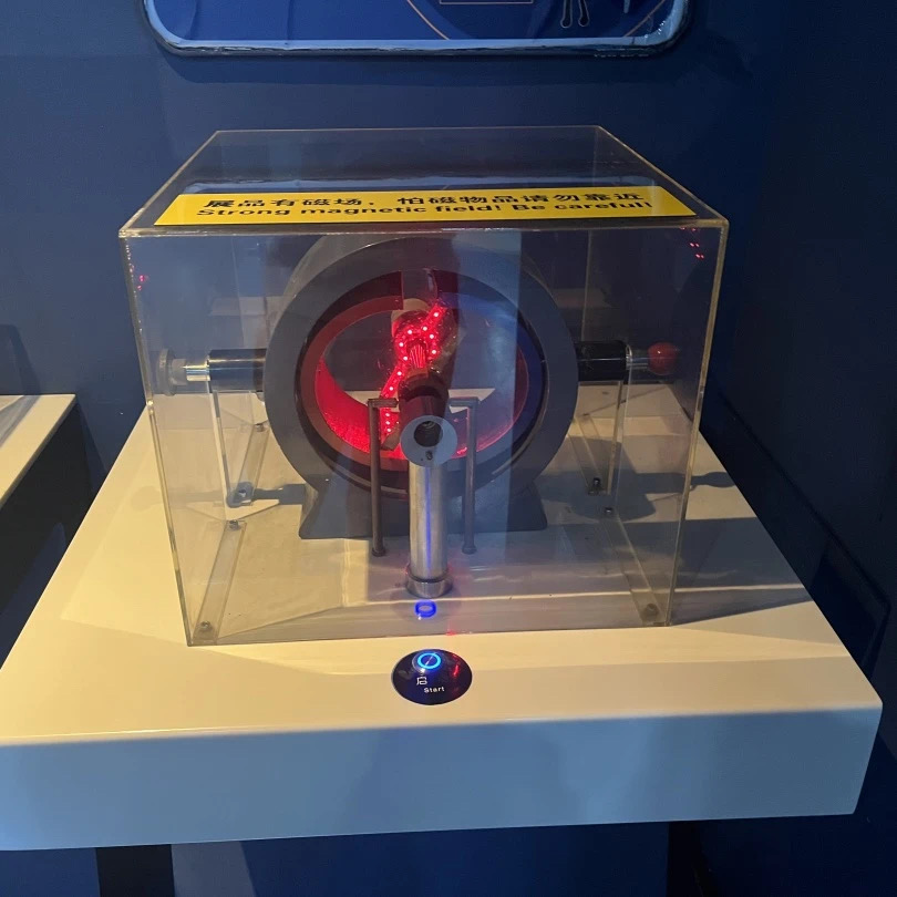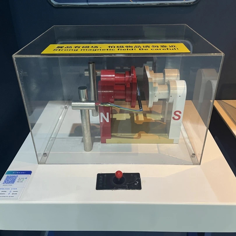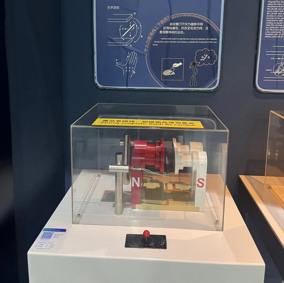 观众可以通过操作展品摇动遥杆来进行发电,并观察直流电与交流电的波形图有什么不同。观众还可以利用感应发电来推动直线电机,驱动轨道上的小车进行运转。