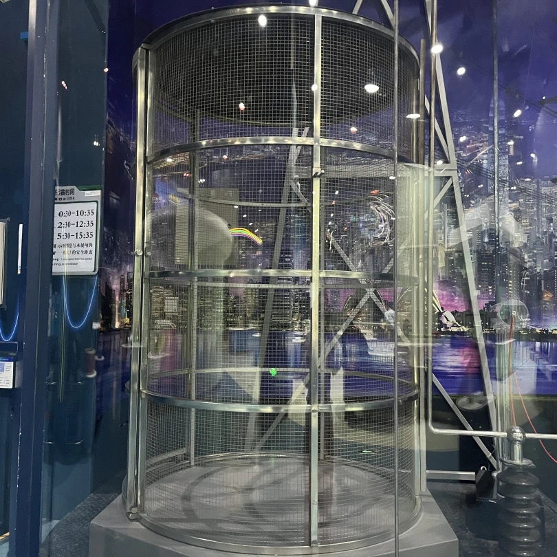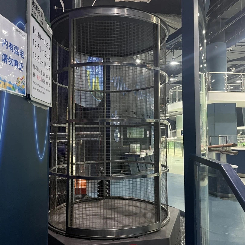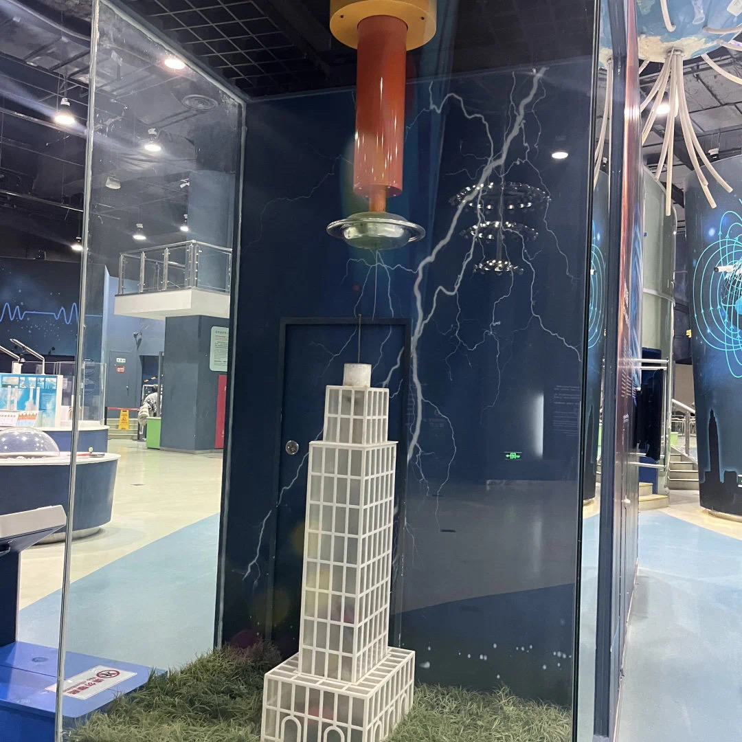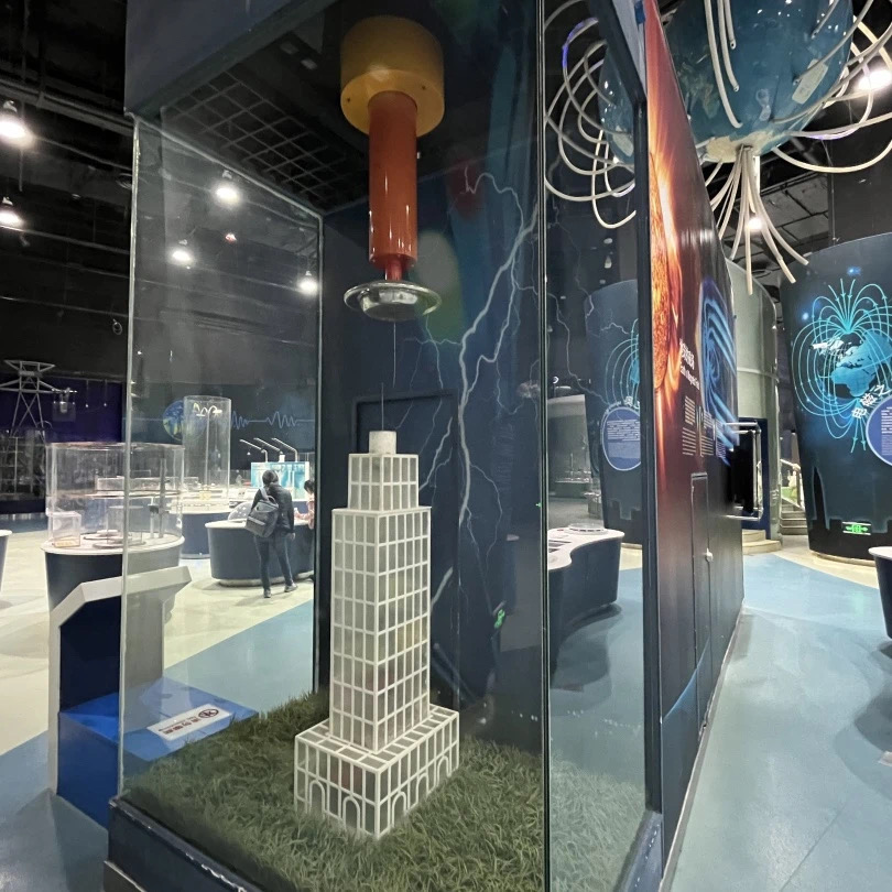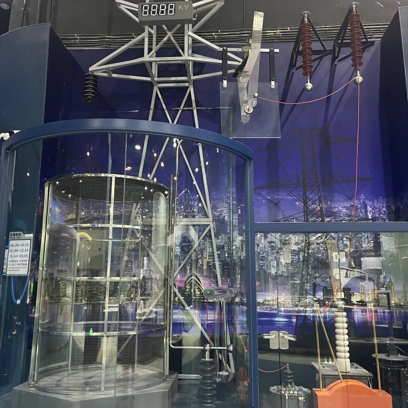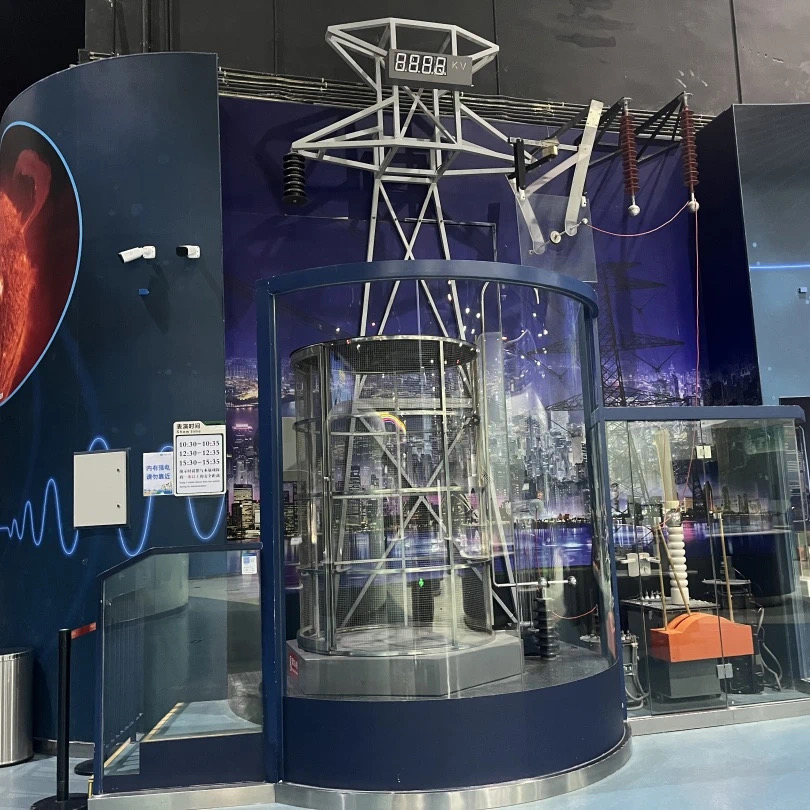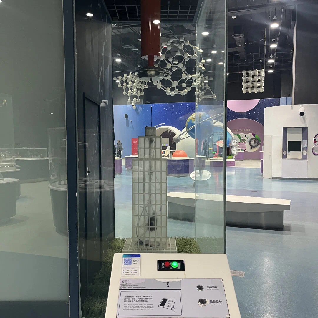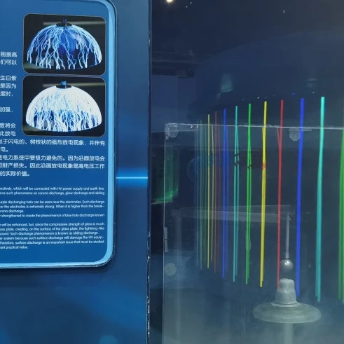 高压放电装置为我们展示了两种高压放电现象。分别是延面放电与弧光放电,延面放电装置也一块透明玻璃板和高压电极组成。当电压升高时透明玻璃板,由于电阻率比较高而周围的空气绝缘线较差,所以电子会沿着玻璃表面走一个最短的路径而产生产生树杈状的沿面放电现象。弧光放电装置又叫做雅各布天梯,它由一根仰角管和一根接地电极组成。两个电极之间并不平行。当我们开启装置时,电极之间会产生一道弧光,并随着时间的推移向上爬升,就像爬梯子一样。沿面放电现象与弧光放电现象在生活当中并不常见,因为它们往往是一种有害的放电现象,我们要避免它的发生。
