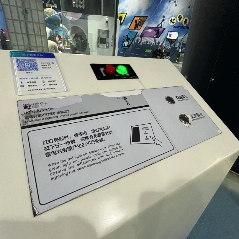 相信大家都知道这么一个人,他叫做富兰克,美国的著名科学家。他做过一个非常著名的实验—风筝实验,将天上的闪电引入到了莱顿屏当中,从而证明了天上的闪电也是一种静电。从此他发明了一种东西叫做避雷针。通过操作这件展品,我们就知道避雷针的工作原理到底是什么,可以知道莱顿屏到底是怎么将电能储存起来的。