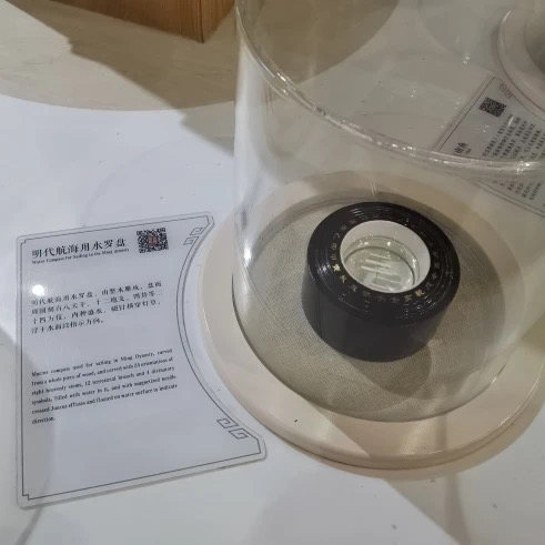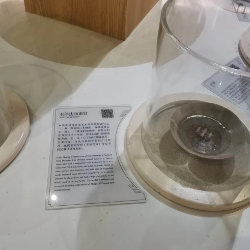 北宋时四种指南针之一。将一根磁化了的钢针,穿几段灯芯草,放入一个盛水的瓷碗中,利用水的浮力使针浮于水面,静止时磁针两端所指为南、北。由于它不怕轻微的摇晃,实用性强,首先在航海中得到广泛使用。此模型是按照《梦溪笔谈》等史书的记载设计复原的。