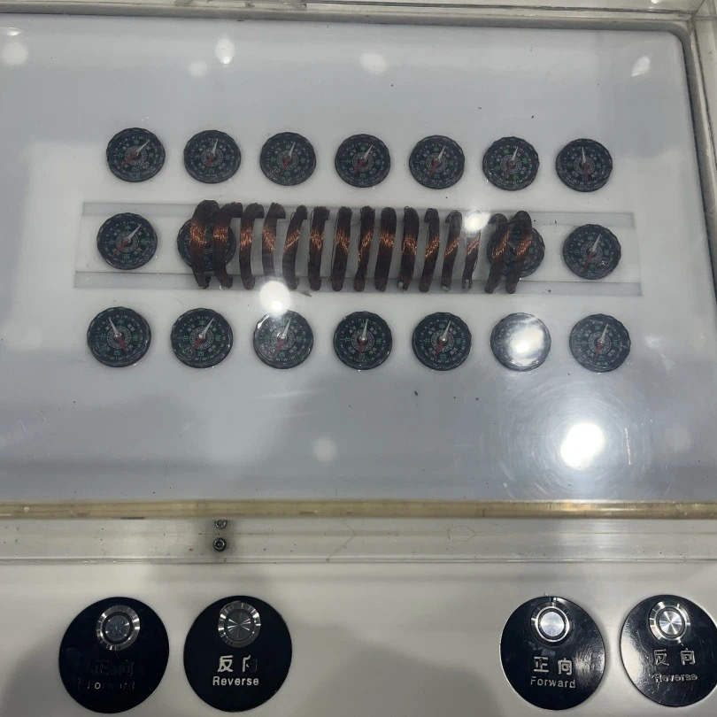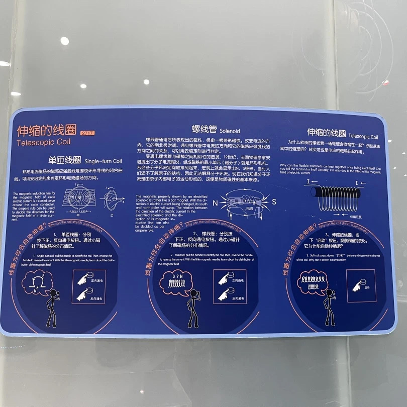相信大家都知道电磁感应定律,也就是电在一定条件下能转化为磁,磁在一定条件下也能转化为电。在伸缩的线圈这件展品中,当我去操作它的时候,我们会发现一通电,原来松散的线圈呢就会紧紧的吸引在了一起。之所以会有这样的现象,是因为呢通电导线的周围是有磁场存在的。而我们通过安培定则就可以来判断出磁场的方向,两个紧密相挨的线圈通电时候,周围就会产生磁场,而方向相同的时候在它们中间的位置磁场是相反的。当多匝线圈紧密排布的时候通电之后它们就会仅仅的吸引在一起,这也就是伸缩的线索的奥秘所在了。