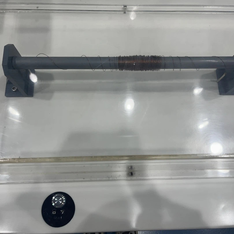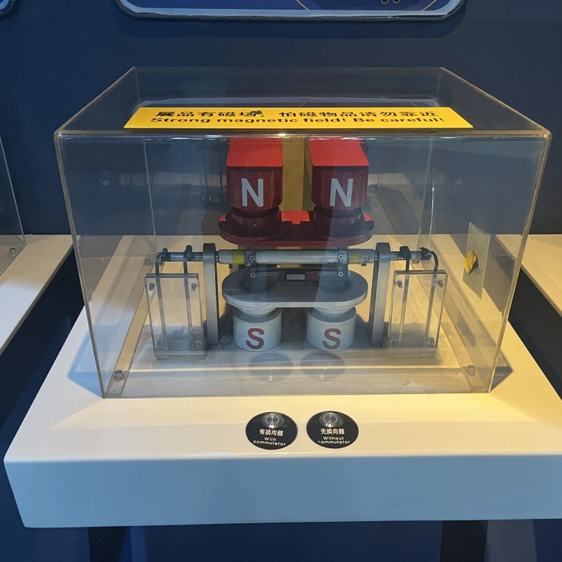 在后面的两个展项中,我们可以来看到磁场的周围有两组线圈,在我们操作按纽按下的时候。我们可以看到线圈可以顺利的旋转。而中段线圈会存在着死点的情况,即它会停止运动,从而使电动机呢无法正常的工作。