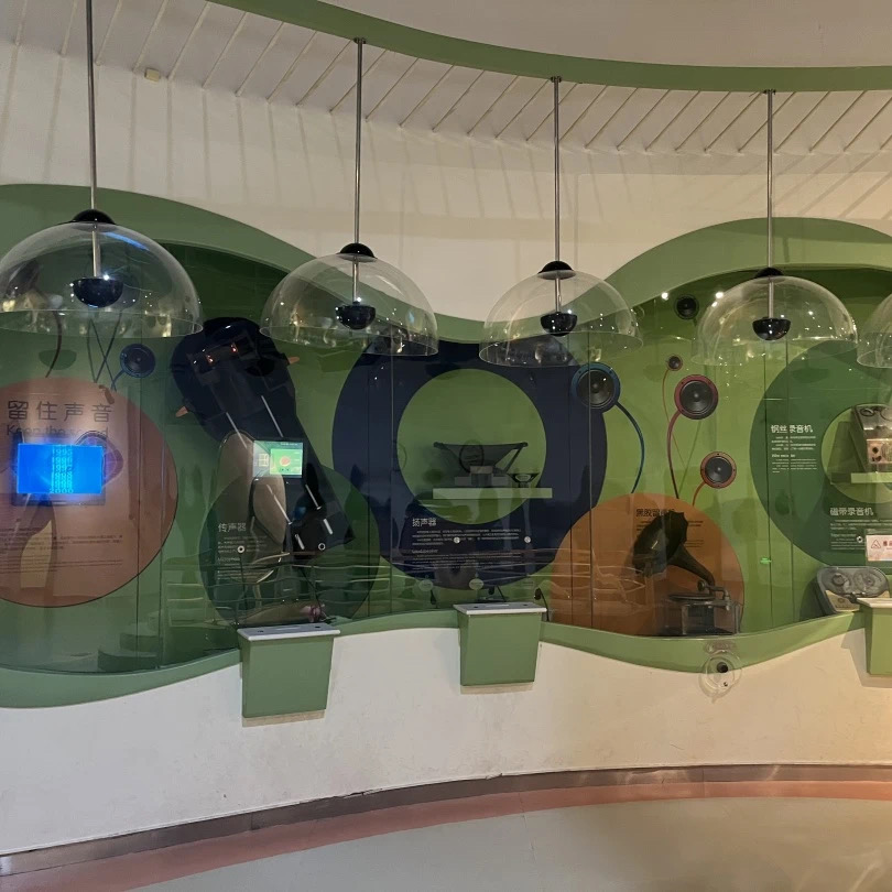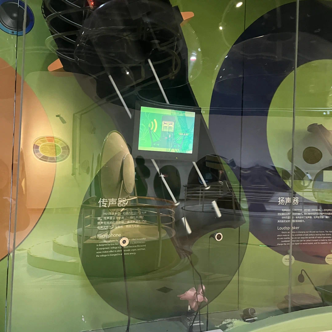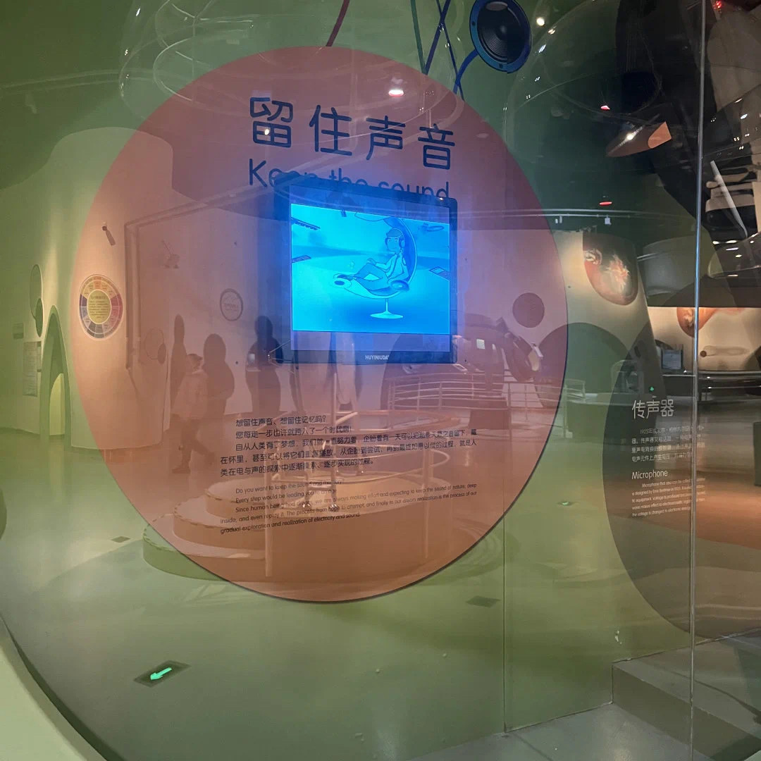 观众可以通过按下展台上的按纽,来看一看录音机是如何工作的,这是一台黑胶留声机,我们可以转动手柄来看一看黑胶留声机是如何工作的,并且我们可以听到黑胶留声机中所发出的声音。这件子展项展现了不同的扬声器,我们按下按纽就可以听到不同扬声器中所发出的声音有什么不同。在这里我们可以按动展台上的按纽,来听一听不同麦克风所录制的声音有哪些不同。这件子展项名叫留住声音,当我们站到这个聚音罩下,它可以感受到人的存在,就会自动播放声音。当我们离开时,声音也会自动停止。
