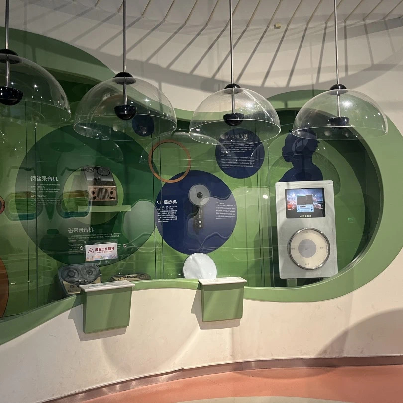 留住声音这件展品是采用多媒体实体物件展示和互动操作的形式,向我们展现了从近代到现代的电声器件和设备的发展历程,和它们的工作原理。这件展品共分为七个子展项,每个子展项的上方都配有一个聚音罩。我们来看第一个子展项。这是一个放大的MP3播放器,通过这个MP3播放器,我们可以感受数码音乐的特点。这是一个CD播放机,通过按动展台上的按纽,我们可以看到光驱播放的过程。