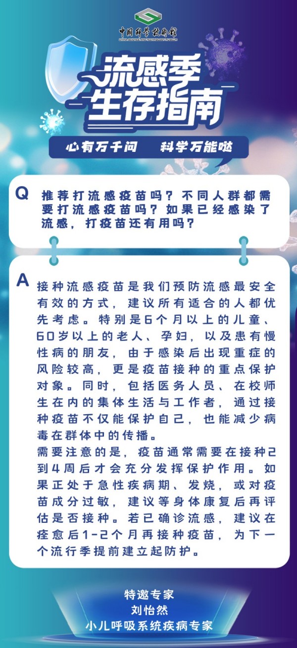 答:接种流感疫苗无法完全避免感染流感,但能显著降低感染概率,且可大幅减少重症、住院和死亡风险。