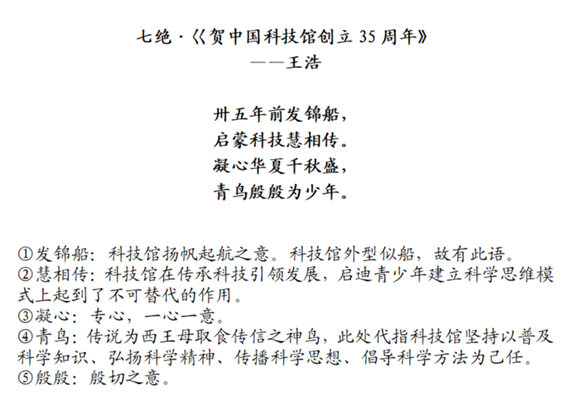 随后,王浩院士还特别为庆祝中国科技馆35周岁生日录制了祝福视频,并赋诗一首,以赞扬中国科技馆在传承科技、引领发展、启迪青少年等方面所起到的不可替代作用。