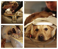 实验中让狗扫核磁分三步:1.让狗躺在核磁床上,主人用表扬和食物奖励狗;2.当一只狗进行扫描时,另一只狗在一边观摩,这时实验者给狗戴上耳机,主人在旁边表扬;3.用绷带固定好线圈后,核磁床开始移动到扫描区域。