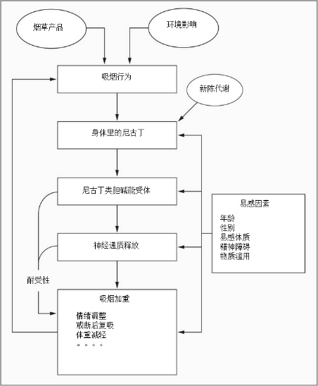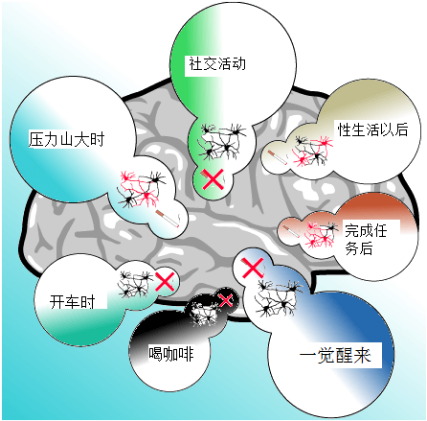 吸入的尼古丁在腹侧被盖区神经元上的乙酰胆碱受体结合,这种结合会促使中脑释放产生欣快感的神经递质——多巴胺,多巴胺神经递质的作用范围非常广泛,如海马、伏隔核、杏仁核和前额叶等脑区,使得大脑认为有好的事情发生,使吸烟者感到愉悦、产生欣快感。为了获得这种欣快感,个体会重复吸烟。同时由于尼古丁具有耐受性,对于吸烟者来说,必须不断增加烟草的吸食量来获取更多的尼古丁以维持生理和心理上对尼古丁的渴求。需要指出的是,这个过程在很大程度上是无意识的,是由大脑中多种神经递质驱使的。