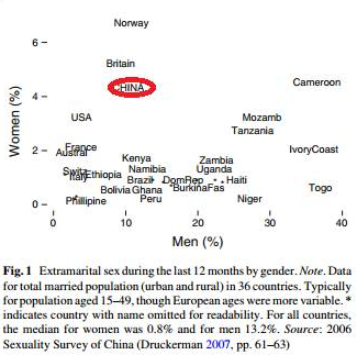如果你觉得美国人太开放,那么中国的数据又是怎么样呢?2006年的中国性关系调查,采访了全国范围内3567名18-49岁已婚或同居者,得到如下数据:4.5% 的女性在过去一年中有不忠行为、11% 的男性在过去一年中有不忠行为(非性交易),这个数据放在世界范围内也并不算低。