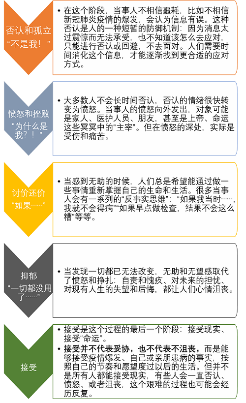 根据Kübler-Ross博士1969年提出的著名的“哀恸五阶段”理论,人们在得知噩耗之后会经历五个情绪反应阶段,分别是否认和孤立、愤怒、讨价还价、抑郁和接受。