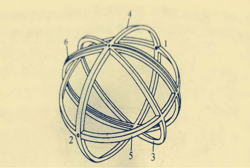 图7 三辰仪环规图(图标数字分别为:1.北天极枢;2.南天极枢;3.赤道环;4.通过二分点的环;5.通过二至点的环;6.黄道环),图片来源于《中国古代天体测量学及天文仪器》