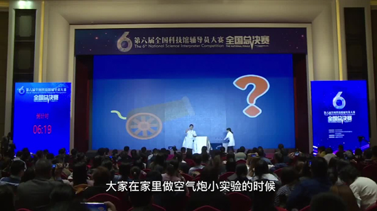 第六届全国科技馆辅导员大赛全国总决赛科学实验表演赛三等奖获奖作品《空气炮三部曲》展播。该作品通过吹蜡烛、不同形状的炮筒打空气炮、水下空气炮等实验,为我们展现了多个与空气炮相关的科学原理。