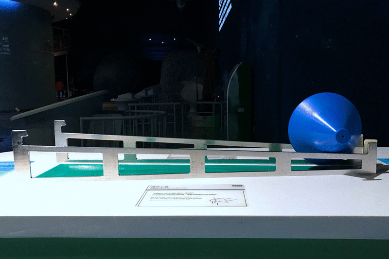 双锥体缓慢的沿着轨道向上滚动。这个展品难道不受重力的控制?