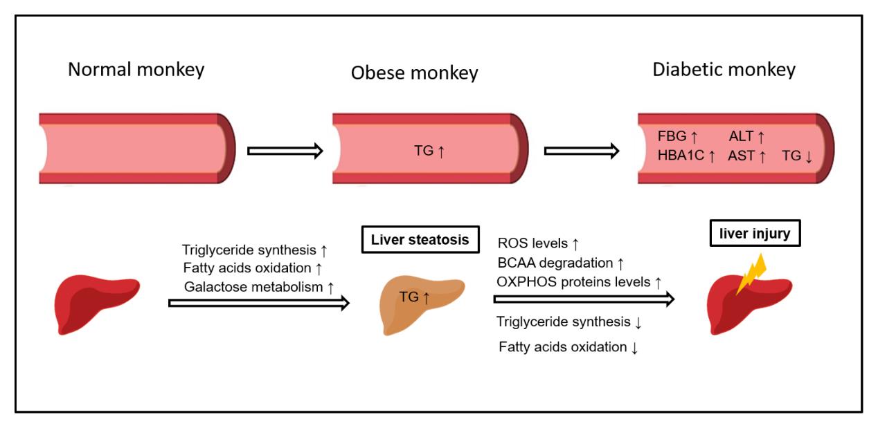 中国科学院昆明动物研究所梁斌团队和中国科学院生物物理研究所刘平生团队合作,历经四年,对昆明动物所饲养的2000多只猕猴进行了大规模筛选,从中成功筛选出一批自发性肥胖和自发性糖尿病猕猴;进一步观察发现,这些猕猴的生理生化指标和人类肥胖和糖尿病非常接近。随后,他们和中科院上海药物研究所周虎团队合作,对自发性肥胖和糖尿病猕猴肝脏进行蛋白质组学研究。肝脏蛋白质组学数据分析和功能实验表明,自发性肥胖猕猴肝脏出现脂肪肝,脂肪酸氧化途径和脂肪合成途径明显上调。该表型和高热量诱导的小鼠模型差别很大,但和人类脂肪肝的表型十分类似。自发性糖尿病猕猴早期出现肥胖和高血脂,而晚期体重和血脂指标下降,出现明显的肝脏损伤;肝脏蛋白质组学显示,氧化磷酸化途径和支链氨基酸降解途径明显上调,肝脏损伤可能是肝脏中过多的ROS通过诱导线粒体释放细胞色素c,并激活胞质中Caspase3所致。该研究首次揭示在自然状况下,由肥胖转为糖尿病过程中,肝脏能量代谢出现从脂肪酸氧化到支链氨基酸降解的转变,为肥胖导致糖尿病的发病机制提供了新的思路。