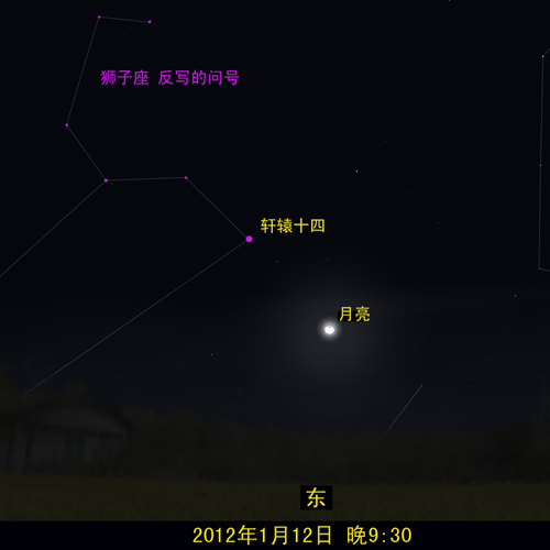 月球每27.3天绕地球公转一周,而从地球上看,它在黄道星座中穿行一周。 轩辕十四几乎位于黄道上,所以,月亮每个月都会从轩辕十四旁边经过一次。