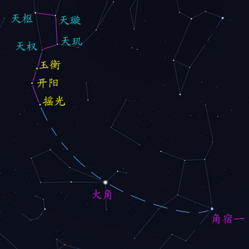 今天日落后,如果天气晴朗,面向东北方,向头顶附近看去,会看到北斗七星当空高悬,斗柄指向东方,顺着斗柄几颗星天权、玉衡、开阳、摇光连成的曲线自然延长出去,遇到的第一颗亮星,是大角星,为牧夫座最的亮星,闪着橙色的光辉。 沿这条曲线继续延伸,从大角星再延长一倍远,可找遇到另一颗亮星角宿一,是室女座最亮的星。这条始于斗柄、止于角宿一的大弧线,就是著名的“春季大曲线”。