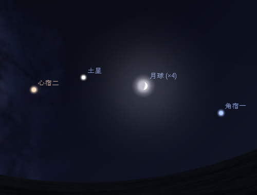 日落后,请看西南方天空,可见三颗亮星与一弯月牙儿构成漂亮的弧线。