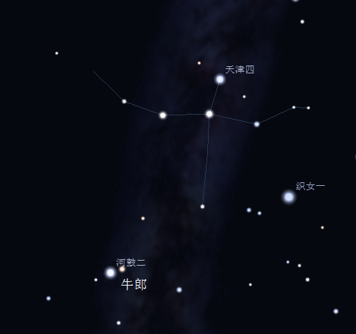 日落后,请看头顶上方夜空,会发现三颗亮星,它们就是夏季大三角,是由牛郎星、织女星和天津四三颗亮星组成的三角形。其中织女星最亮,靠近西边;牛郎星第二亮,在东边。而天津四则位于北边。天津四的英文名字的意思是尾巴。它就是天鹅的尾巴,找到它,就找到了天鹅座十字形,也就找到了银河。