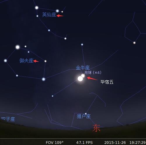 如果你还未在星空中找到过金牛座,没有欣赏过毕宿五,那么今晚是个好机会。今天日落后,如果天气晴朗,就去看看东边星空,会欣赏到毕宿五伴月的景象。