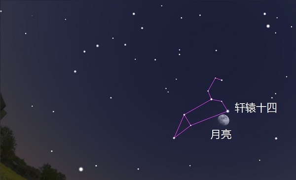 狮子座是著名的黄道星座。狮子座中最亮的星叫做轩辕十四。轩辕十四位于黄道带上,日、月、行星常常来到它附近。今天晚上,月亮就来到轩辕十四附近。日落后,如果天气晴朗,那么在东南方高空能看到大半个月亮,在它右上方有颗亮星,那就轩辕十四。