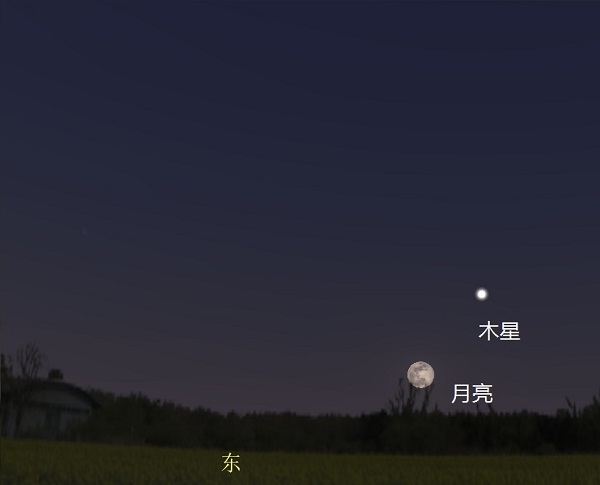 日落后,如果天气晴朗,你会在圆圆的月亮右上方看到一颗亮星,那就是木星。