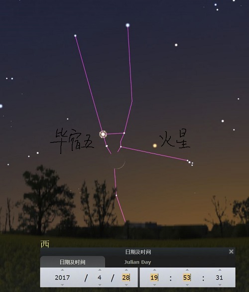 今天日落后,如果天气晴朗,在西方低空,会看到一弯月牙儿,在月牙儿左上方和右上方,有两颗红色亮星:右上方的那颗是火星,左上方那颗是毕宿五。