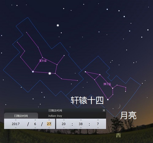 今天日落后,如果天气晴朗,请看西边天空,那儿有一弯月牙儿,月牙儿正位于狮子座中,朝它弯向的方向看去,有颗亮星,那就是狮子座中最亮的星轩辕十四。