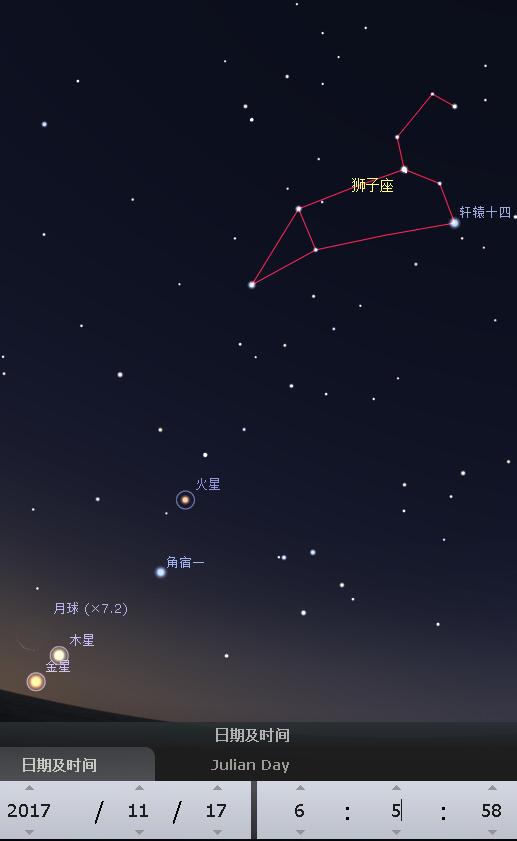 如果想观测狮子座流星雨,那么就在今天、明天去尝试吧。一定注意保暖,更要注意安全!今天清晨,残月会出现在金星、木星附近,呈现双星伴月的景象。