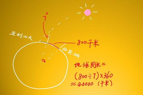 厄拉多塞通过测量在亚历山大的杆长和影长,得出太阳光线与杆的夹角为7°,根据平面几何内错角相等,得出两地长竿在地心的交角为7°。厄拉多塞雇人走路,测出从亚历山大到西恩纳之间的距离为800千米。800千米除以7°,得出1°对应的长度,地球周长为360°,乘以360°,就得出地球周长,大约为4万千米。这个答案是正确的。