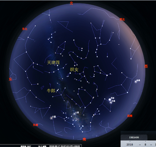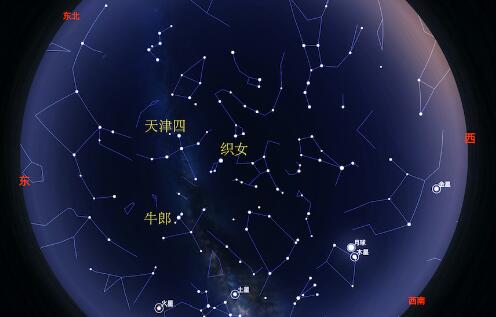 七夕节,天黑后,在头顶附近,有一颗亮星呈白色,那就是织女星(Vega)。在它东北方不远处,有颗亮星,天津四(Deneb);在织女星东南方向不远处也有颗亮星,那就是牛郎星(Altair),也被称为牵牛星、河鼓二。用假象的线连接它们,就会组成一个大三角形。这就是著名的夏季大三角。