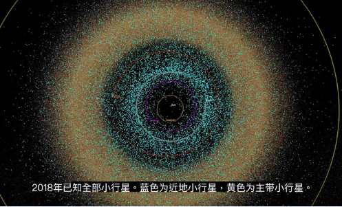 图中蓝色代表近地小行星,黄色代表位于火星和木星之间的主带小行星。