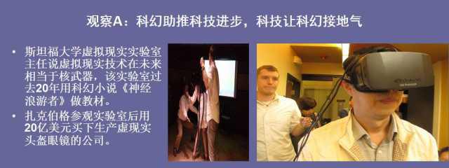 强烈的科幻感是美国高科技公司及大学实验室中突出的因素。斯坦福大学的虚拟现实实验室,已经走在很前沿,通过他们的产品,能真正感受到阿凡达的世界。该实验室在过去的二十年,用的是《神经浪游者》做教材进行教学。