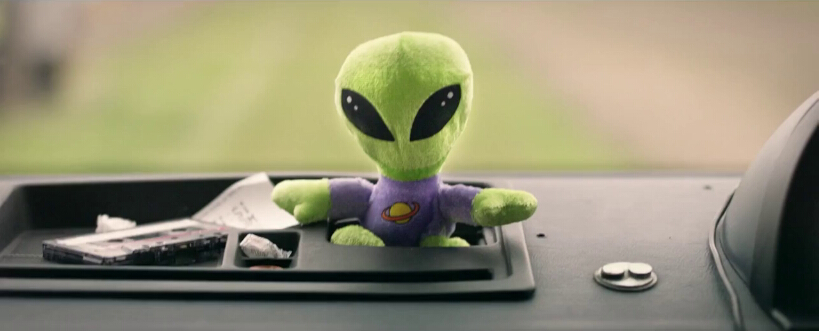从导游大姐不着调的介绍着麦田怪圈开始,整部影片就被一种轻松而神秘的气息笼罩着。坐在大巴车上的外星人朝圣者包括威尔士口音浓重的小女孩,狂热热爱外星人的极客大叔等。车头摆放的绿色外星人玩偶是各种科幻片或搞笑片中经典的外星人造型,但是,只要外星人被设计成这种大头、大眼睛、细脖子、小身子的形象,十有八九就是一部喜剧片。比如2011年的喜剧科幻片《保罗》中的外星人保罗,就是一个这般造型不着调的外星屌丝。