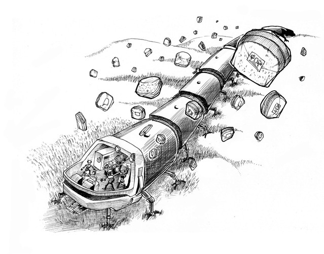 机械臂抓了个空,但微型机器人们并未注意到有何不同。它们仔细地把抓到的空气堆叠起来,一层又一层。一只迷路的面包飞得慢吞吞的,比同伴们都慢些,被一只猛然伸出的爪子逮了个正着。机械臂顿了一下,笨拙地把这只受伤的面包甩到一边——面包一角被抓破了个口子,没法再飞起来了——然后又继续开始它的囤积大业,尽管传送带上空空如也。
