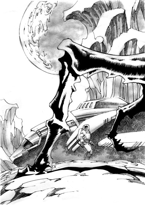 他依旧待在洞口,一动不动地躺着,交替观察着天空和飞船。有一两次他也许打起了瞌睡,不过,在飞船船体的另一边,当低矮的小山染上初升太阳的第一缕曙光时,他警觉地醒来了。有一两分钟时间,那些山似乎悬挂在黑色的虚空里,互不关联,而蓝白色的光芒如同潮水一般沿着山坡向下蔓延。然后,一个接着一个,群山的基部联在一起,并与下边的大地合为一体,形成了一幅和谐的风景。银色的船体闪烁着灿烂的光芒,它反射的光线照亮了坎宁安身后的洞窟。他想看着即将打开的气密舱门,眼睛却被光线刺激得流出了泪水。