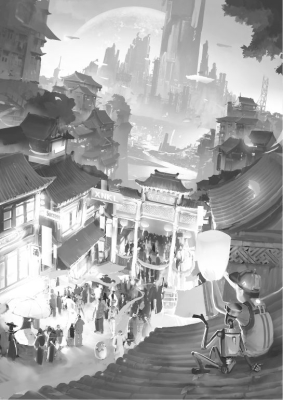 宽敞的街道两旁是悉心保养的罕有木制楼房,房顶上铺的是更为坚固美观的琉璃瓦。这些沿街楼房皆是店铺,墙上嵌着大大小小交错闪耀的霓虹灯招牌、激光投影广告牌,让人眼花缭乱。在街道上空,还有数条长长的生物全息投影随风飘动,那形状是一种长着角的珍稀古代物种——龙。