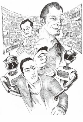 办公室的门被推开,门外站着两名机器警察——阿甲和阿乙。他们收到警告,来处理异常情况。十分钟之内定位,二十分钟内拘捕,这是金融警察引以为荣的高效。现在,嫌犯就在总局,所以不到两分钟,机器警察就已经登门拜访。