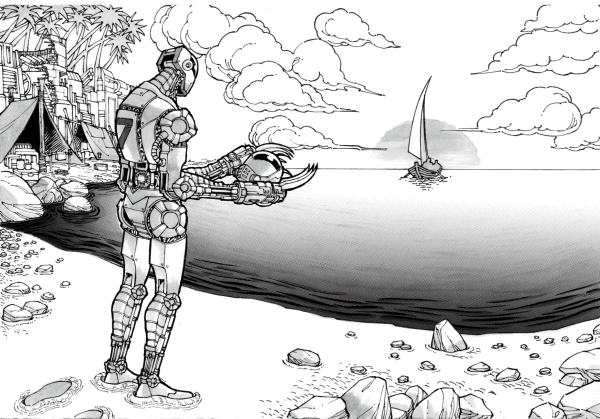 7号伸出一只操纵臂,帮那家伙将船推到海边,尽可能地靠近海浪,然后退了回来。它跳了进去,小船摇晃了几下,最终稳定了下来。