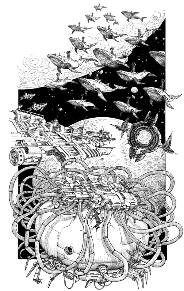 三个附着式推进器从子夜港表面脱离,向前方的太空鲸群驶去。它们就是洱星工程师专门为太空鲸开发的辅助推进器——鮣鱼艇。这三艘鮣鱼艇已在子夜港的黑夜中被束缚了五十年,现在即将完成最后的使命。