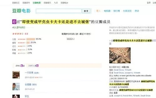 这种故事有很多变体。类似的有某君在豆瓣上建立了一个子虚乌有的电影词条,电影名叫《即使变成甲壳虫卡夫卡还是进不去城堡》,据说词条有模有样,演职员表、海报与截图甚至经典台词都一应俱全。果然没过多久,便有数百条留言在词条下批评起这部电影的立意、手法和风格,活脱脱是一个大型尴尬现场。